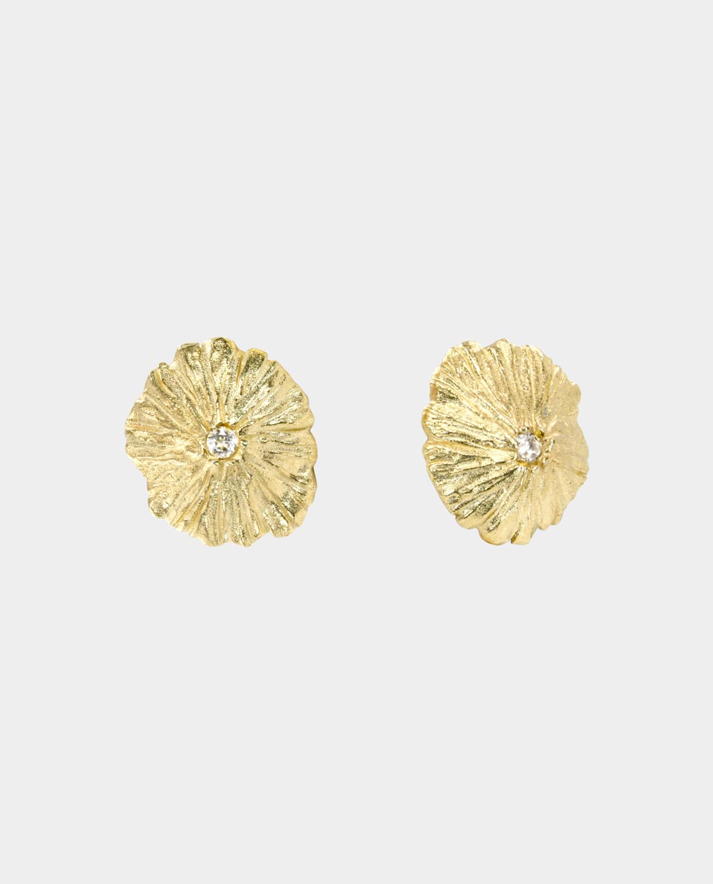 Øreringene er inspireret af de parasolhatte, jeg har set på mine ture i skoven. Overfladen er gjort mere levende og skinner som en lille guldblomst. Smykket har samme runde, let buede form som en åben parasol, hvor de rillede linjer skaber effekten af fol