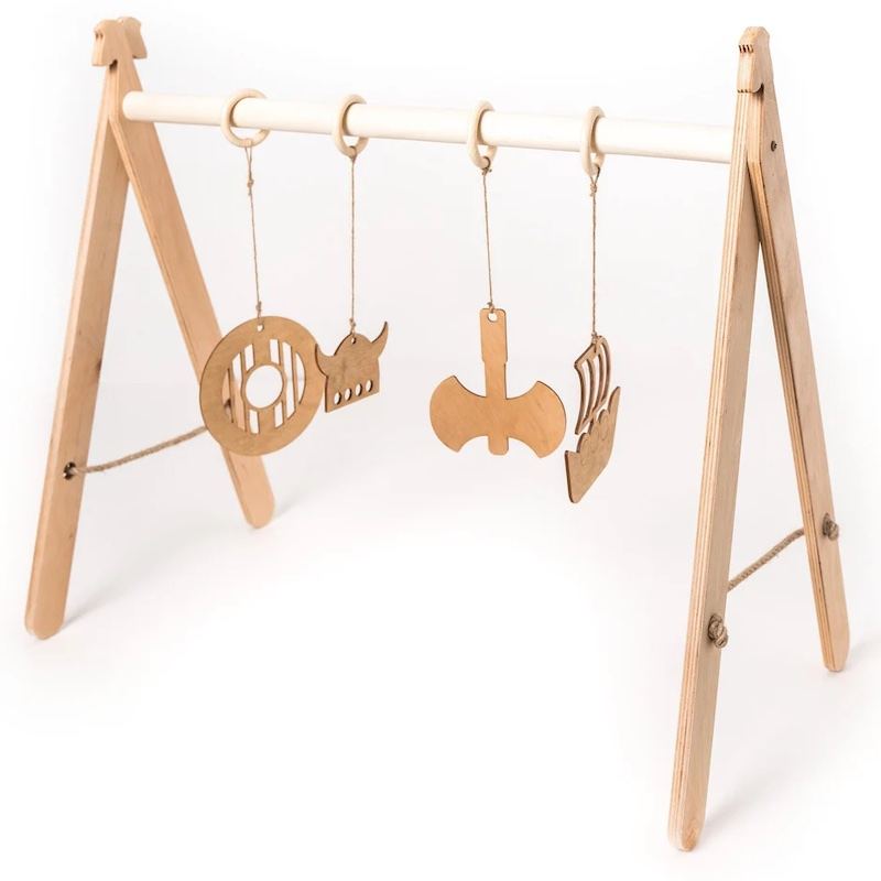 Flot aktivitetsstativ med 4 ophæng med vikinge design Aktivitetsstativ i krydsfiner på 65 cm x 31 cm x 59 cm. Stativet er designet til babyer på 0-12 måneder. Det er sjovt og lærerigt for barnet at benytte aktivitetslegetøjet. Man kan placere en lille mad
