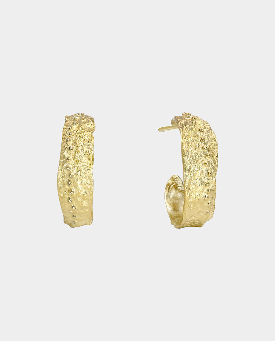 Kreolernes tekstur får mig til at tænke på et korallrevs porøse overflade, eroderet af århundreders bølgeslag. De tætsiddende knopper og uregelmæssige fordybninger skaber et relief, der genskinner som dråber på en grusvej, regnen netop har forladt. Smykke