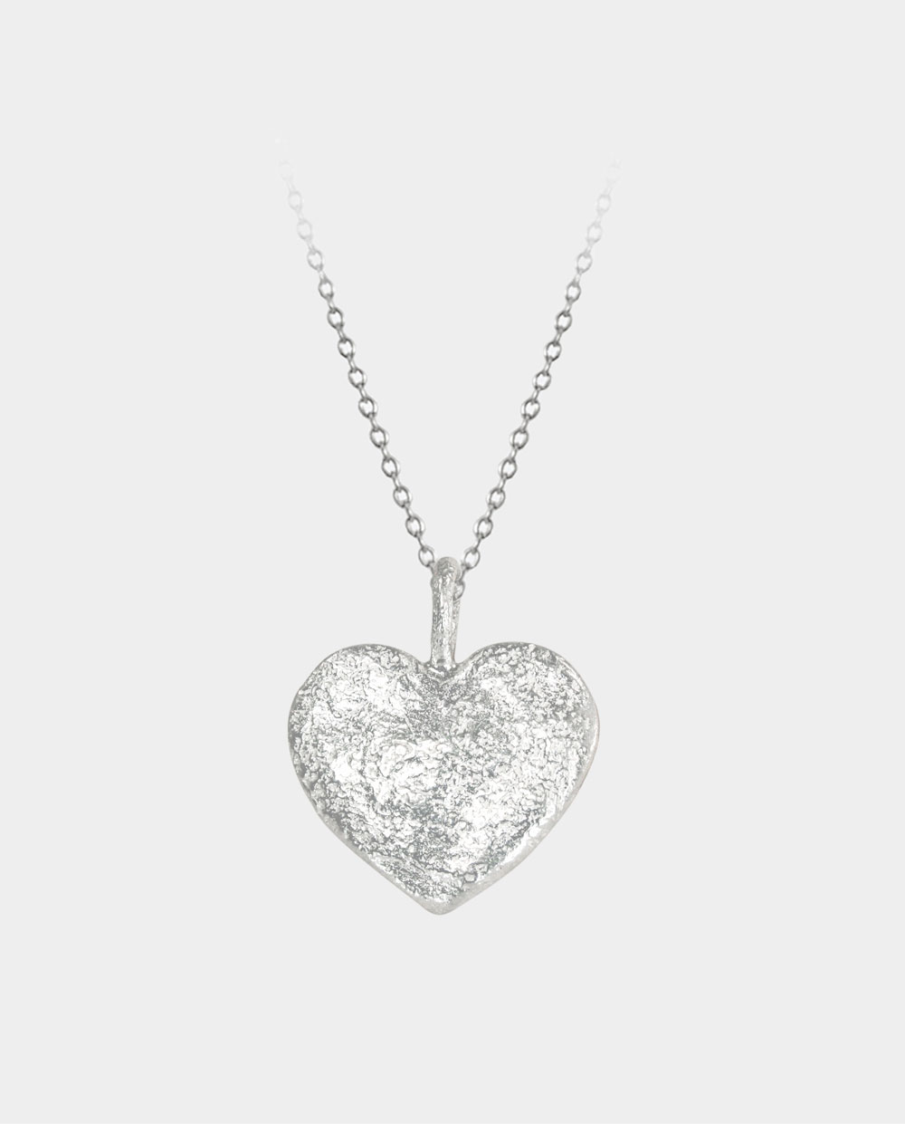 Sølvhjertets teksturerede overflade bærer diskrete spor af den kraft, der formede det. Kæden leder blikket ned til vedhængets bløde kontur og sølvets kølige tone. Min tanke med smykket er at skabe et hjerte, der er ærligt og levende i sin ujævnhed, som fo