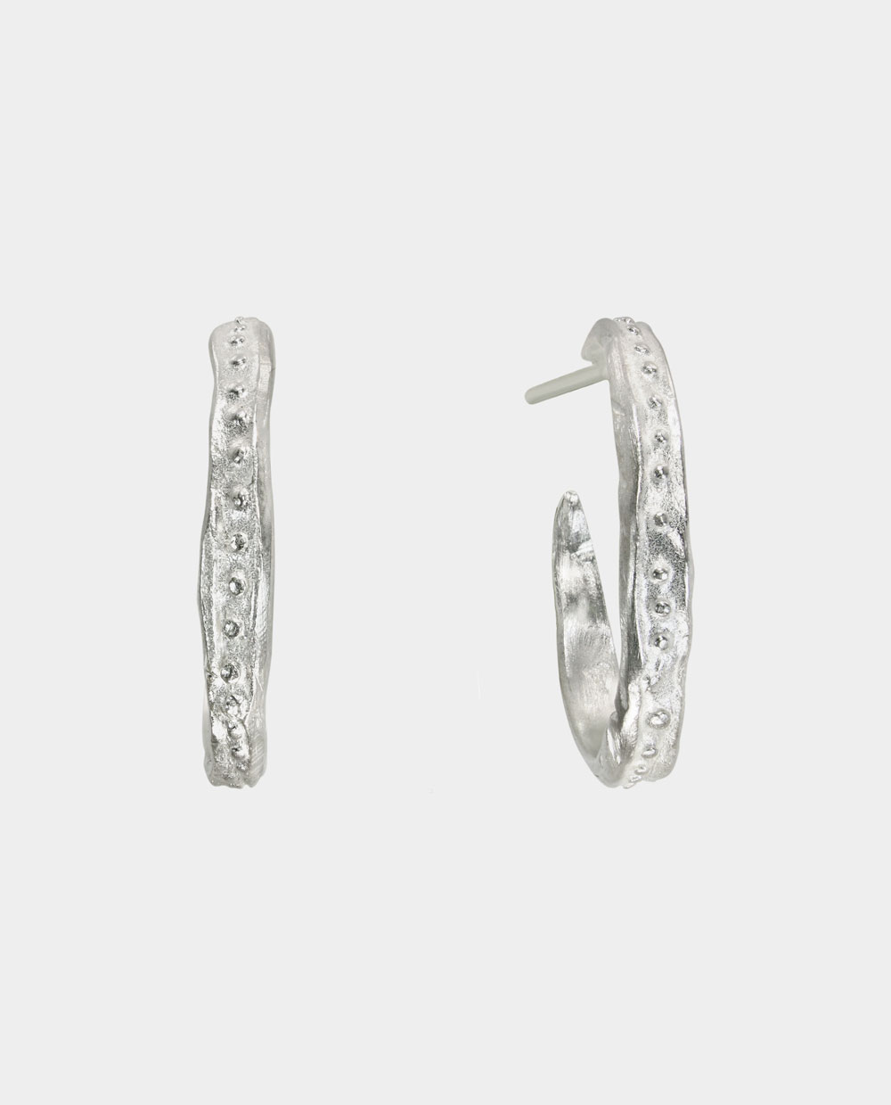 Kreolernes mønster er uregelmæssigt spredt som spor efter et skybrud på en stenet sti. Hver en bule, hver en fordybning fortæller om håndens bevægelse, materialets modstand og formbarhed. Bæreren bliver det lærred, hvor de små sølvskulpturer interagerer m