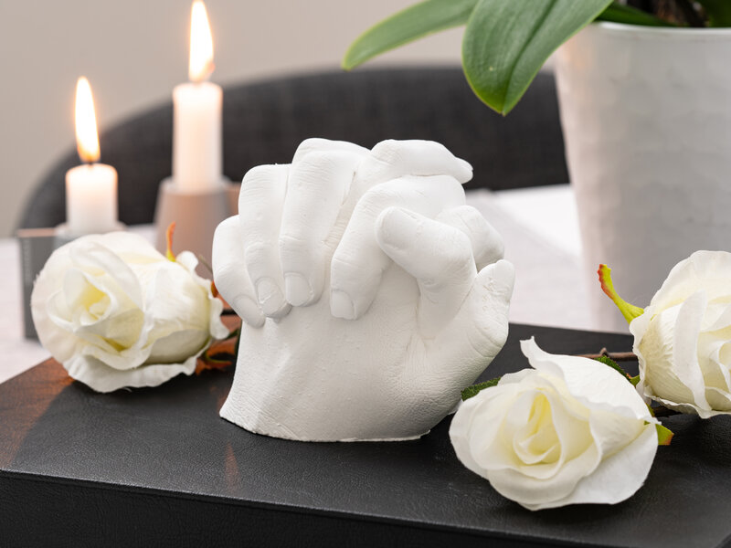 Fotoforstørrelser, indgraverede glasskulpturer og matchende tatoveringer begynder at føles lidt passé. Udødeliggør i stedet jeres kærlighed på en kreativ og romantisk måde med et håndafstøbningskit, der gengiver jeres ømt forenede hænder i gips.