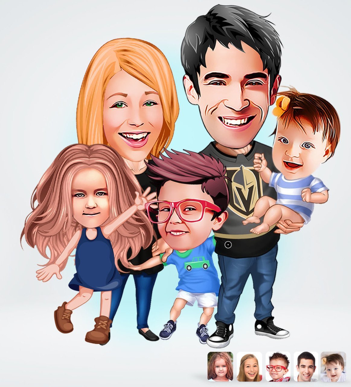 Familie tema4 (5 personer) – karikaturtegning efter dine fotos