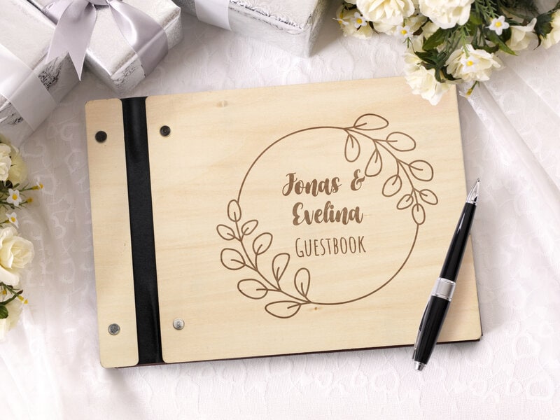 En gæstebog i træ med egen tekst bliver et smukt og mindeværdigt indslag til enhver sammenkomst. Det naturlige træg materiale og den personlige gravering gør bogen både unik og tidløs – perfekt til at samle hilsner, minder og varme ord fra gæsterne.