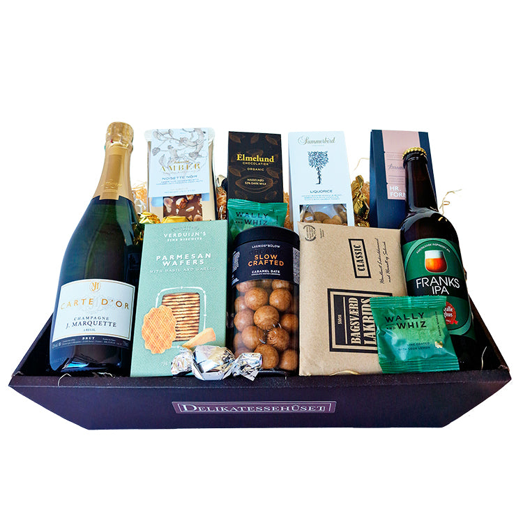 når kun det bedste er godt nok – Send en Champagne-hilsen til én, der virkelig fortjener en særlig gestus. Kurven her indeholder vores J. Marquette Champagne Carte D’or. Her er tale om en luksuriøs Champagne med en indbydende smagsprofil, der bl.a. byder
