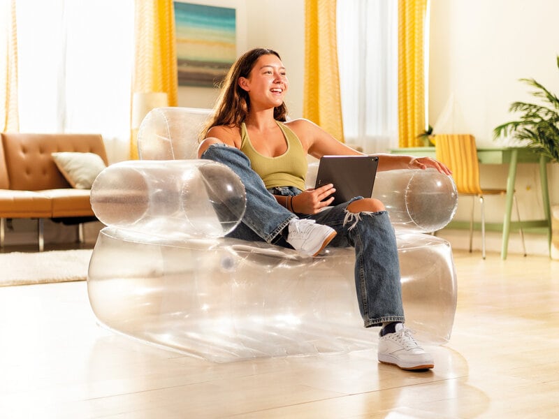 Opdag et helt nyt niveau af stil og komfort med denne gennemsigtige oppustelige lænestol fra Intex! En unik møbel, der tager din indretning til nye højder.