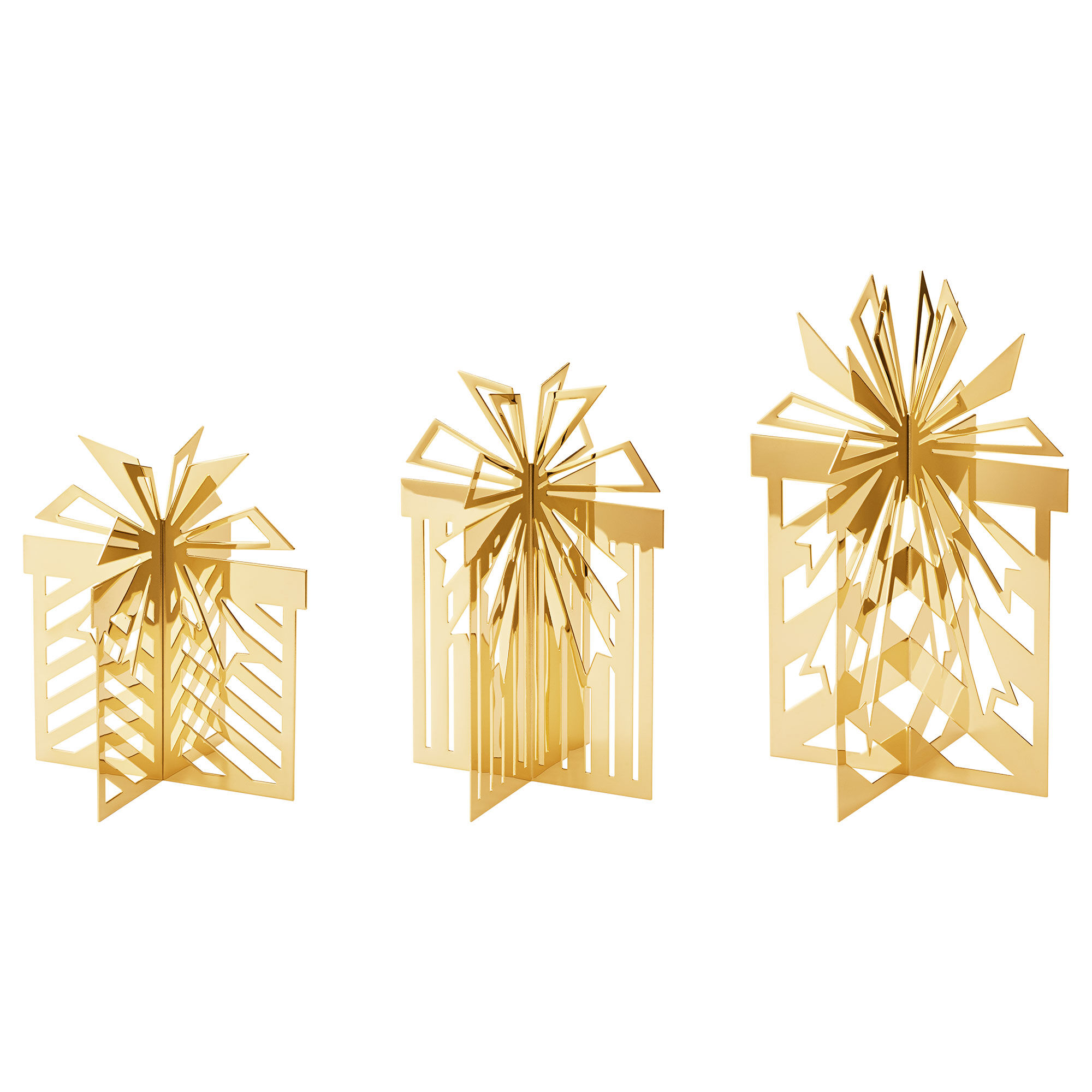 Georg Jensen bringer varme og julestemning ind i hjemmet med sættet smukt formgivet julepynt i CC 2025-serien, der alle er udformet som gaver i forskellige størrelser. Hver gave er belagt med 18 karat gult guld og prydet med en detaljeret sløjfe, der giver et raffineret udtryk.