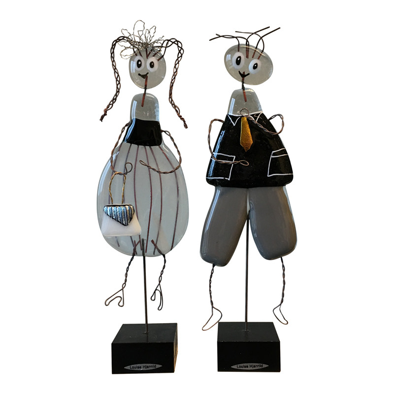 Skønt par i glas i flotte sorte, grå og hvide farver. Kvinden og manden kan pynte flot i ethvert hjem og kunne være alletiders gave til kæresteparret, bryllup, indflyttergave eller andre særlige anledninger – højde ca. 22 cm SÆT
