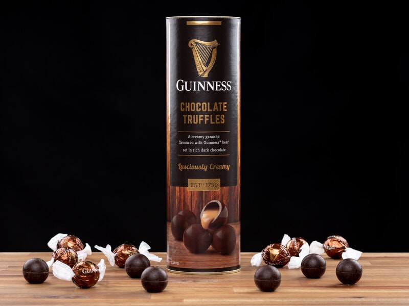 Leder du efter en gave til en, der både kan lide øl og chokolade? Perfekt, disse Guinness-trøfler i flot gaveindpakning kombinerer den klassiske, fyldige ølsmag med kraftig mørk chokolade, og der opstår mild harmoni!