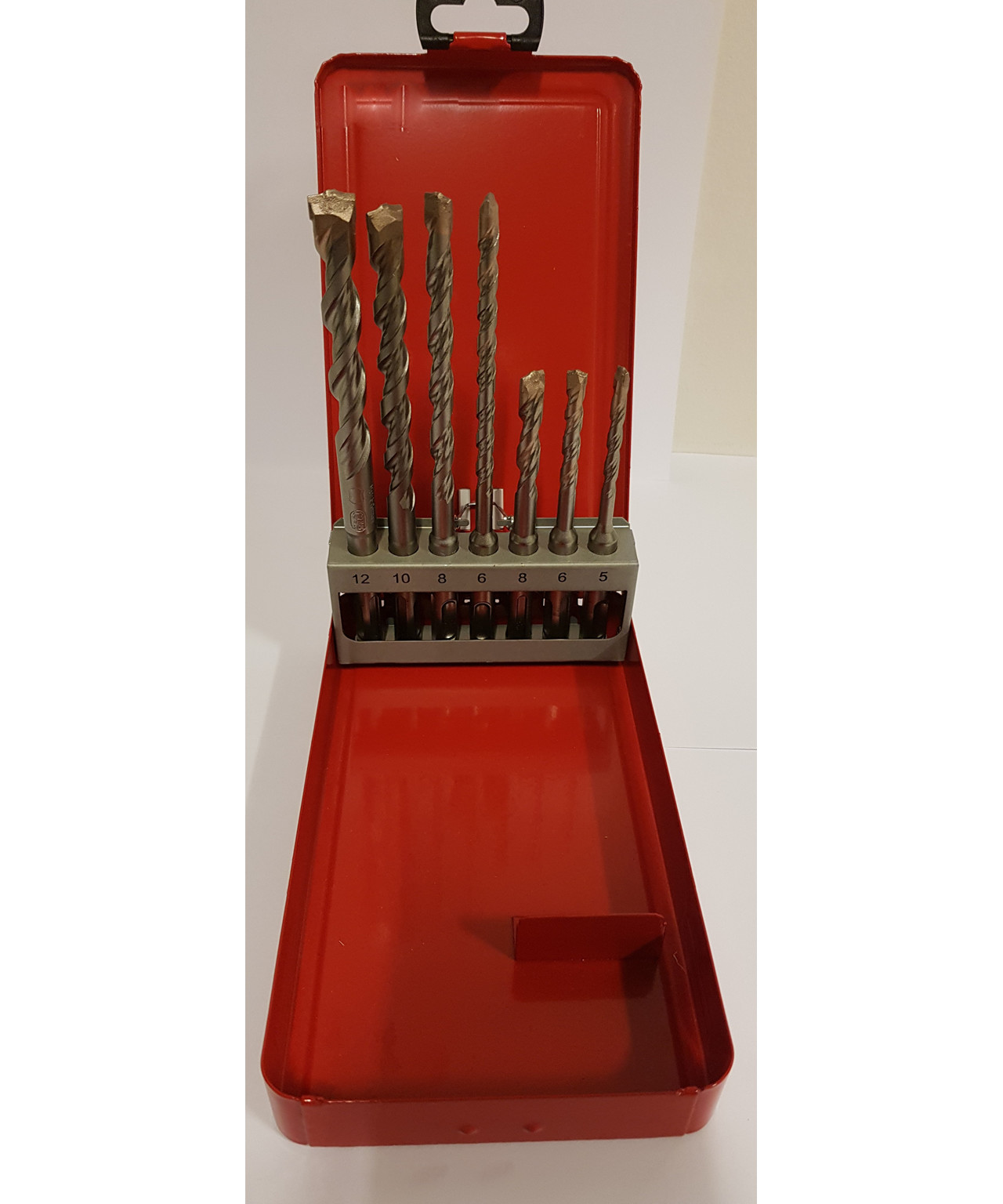 SDS-plus hammerborsæt i rød kasse. Indhold SDS-plus hammerbor 2-skærs.Ø5,0-6,0-8,0×110 mm ogØ6,0-8,0-10,0-12,0×160 mm. Meget høj stabilitet som gennem kerneforstærkning giver maximal kraftoverførelse fra borhammer til borspids. Stor slidstyrke pågrund af speciel behandling af stålet. Spiral for optimal boremelstransport. Særdeles velegnet til befæstigelsesarbejde. Hammerfast hårdmetalplatte af speciallegering. Anvendes til granit, beton, klinker, murværk, fliser og marmor. Kan bruges i alle maskiner med SDS-plus holder eller 2-spor-holder