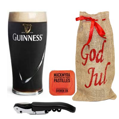 Juletaske i sæk med rødt bånd indeholdende en kasketåbner, pastiller fra Mackmyra og et klassisk ølglas fra det irske bryggeri Guinness. En perfekt gave til alle Guinness elskere.BEMÆRK: Smag af Mackmyra-pastiller vælges tilfældigt eller efter tilgængelighed mellem varianterne Swedish Oak eller Swedish Smoke.—Guinness ølglas Relief. Denne stildannende irske stout har formentlig været porten for mange ind i verden af mørke øl. Brændte toner og lækker bitterhed går godt sammen i denne fyldige bryg! Naturligvis bedst nydes i et originalt Guinness ølglas. Lad det smage godt!