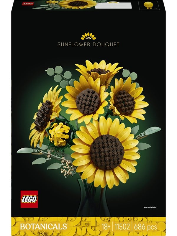 Byg en skøn blomsterdekoration med LEGO® Botanicals sættet Solsikkebuket, et kreativt byggesæt til voksne. Lav 1 solsikkeknop, 3 solsikker, der lige er sprunget ud, og 2 store, åbne solsikker samt 4 grene med eukalyptusblade, og arranger LEGO planterne i en helt unik buket. Når du er færdig, kan du udstille buketten eller give den som en betænksom gave. Buketten indeholder 6 LEGO® solsikker i forskellige blomstringsstadier Med 4 eukalyptusgrene og justerbare kronblade samt stilke Udstil solsikkerne som et farverigt indretningselement med blomster i hjemmet eller på kontoret En god gave til fødselsdag, valentinsdag, mors dag eller housewarming for naturfans Tilgængelig i LEGO® Builder appen, hvor blomsterfans kan følge deres byggefremskridt 18+, 686 elements, 382mm x 262mm x 70,5mm
