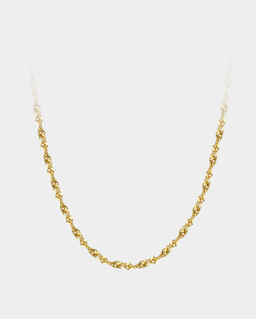 Denne kæde er en strøm af flydende guldlys. Hvert lille led er en hvirvel, en dans, der griber lyset og kaster det tilbage med en blød, mættet glød, der er helt dens egen. Halskæden snor sig ganske naturligt på fineste vis. Og når du bevæger dig, så vågne
