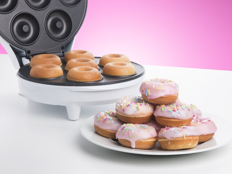 Som et vaffeljern, men beregnet til minidonuts! Varm maskinen op, hæld dejen i, vent nogle minutter og tag så de perfekte minidonuts ud!
