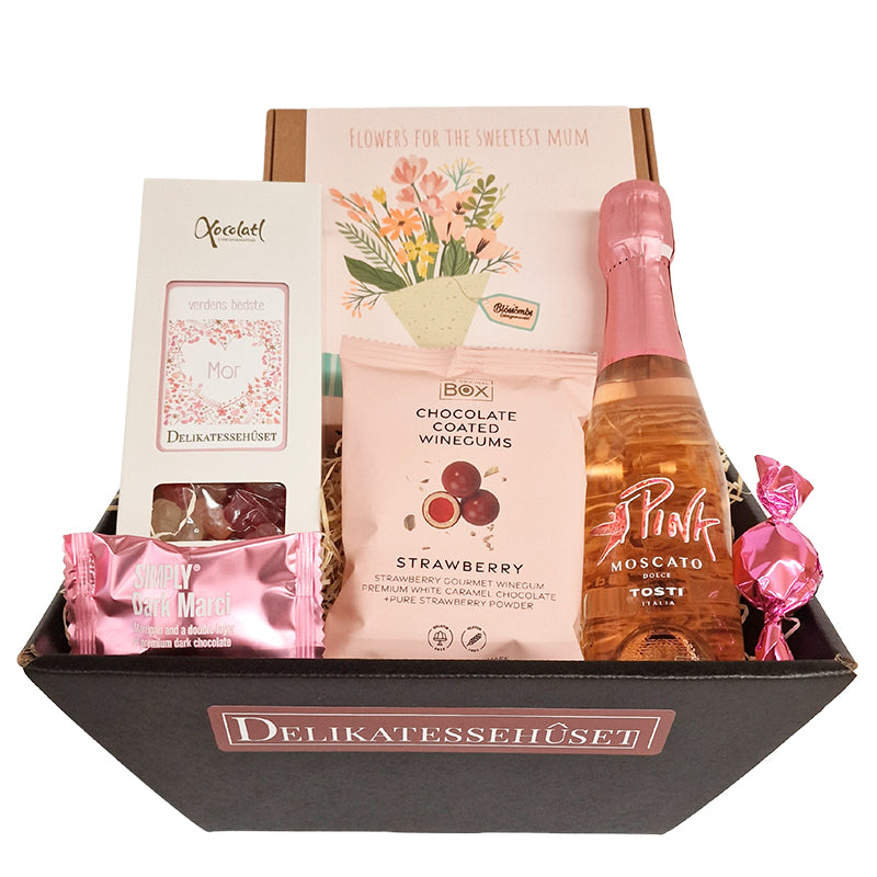 Mors dag gave med blomsterfrø, rosébobler og vingummi