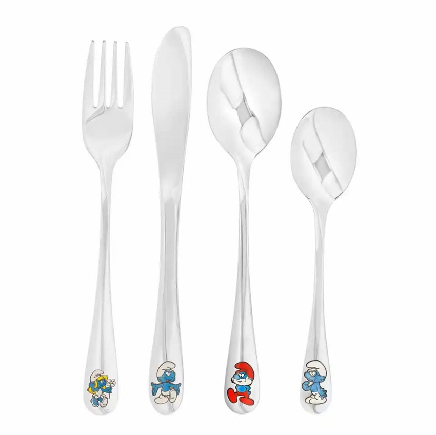 Elsker du også Smølferne? Nu kan du få et bestiksæt til børn med Smølferne. Bestiksættet består af 4 dele, kniv og gaffel samt en spise ske og en teske. På hvert bestik ser du en af de kendte smølfer som: Smølfine og Gammel smølf, Normal smølf og Kloge smølf med farvet emalje.Børnebestiksætteter ikke kun praktisk, men også en sød gaveide til både barnedåb og børnefødselsdag. Motivet med”Smølferne”er kendt fra fra den belgiske tegneserie af Pierre”Peyo”Culliford, der først kom på historien om de små blå væsner i 1958.Bestiksættet er fremstillet af Nordahl Andersen og du kan være sikker på, at dette bestiksæt er holdbart og af højeste kvalitet. Med materiale af stål er det også nemt at rengøre og vedligeholde. Gør måltidstid sjov og spændende fordit barn med NOA Kids bestiksæt. Bestil nu og lad dit barn nyde måltiderne med stil og charme!OBS: Ang gravering – Ved valg af gravering af bestik er betaling for dette kun på en af bestik delene. Hvis der ikke er kommenteret andet, graverer vi altid på den store ske. Ved gravering af alledele skal der tilkøbes gravering til hver del.