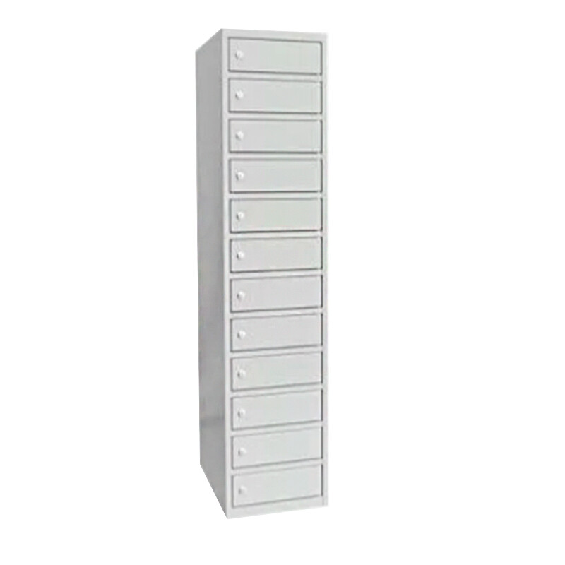 PC skab med el til opladning af laptop – bærbar computer. 12 rum i højden med lige tag. Pulverlakeret kabinet og døre. Lysgrå kabinet, RAL 7035, og lysgrå døre, RAL 7035. Levereres med færdigmonteret cylinderlås i dørene. Dim (hxbxd): 1752 x 400 x 550