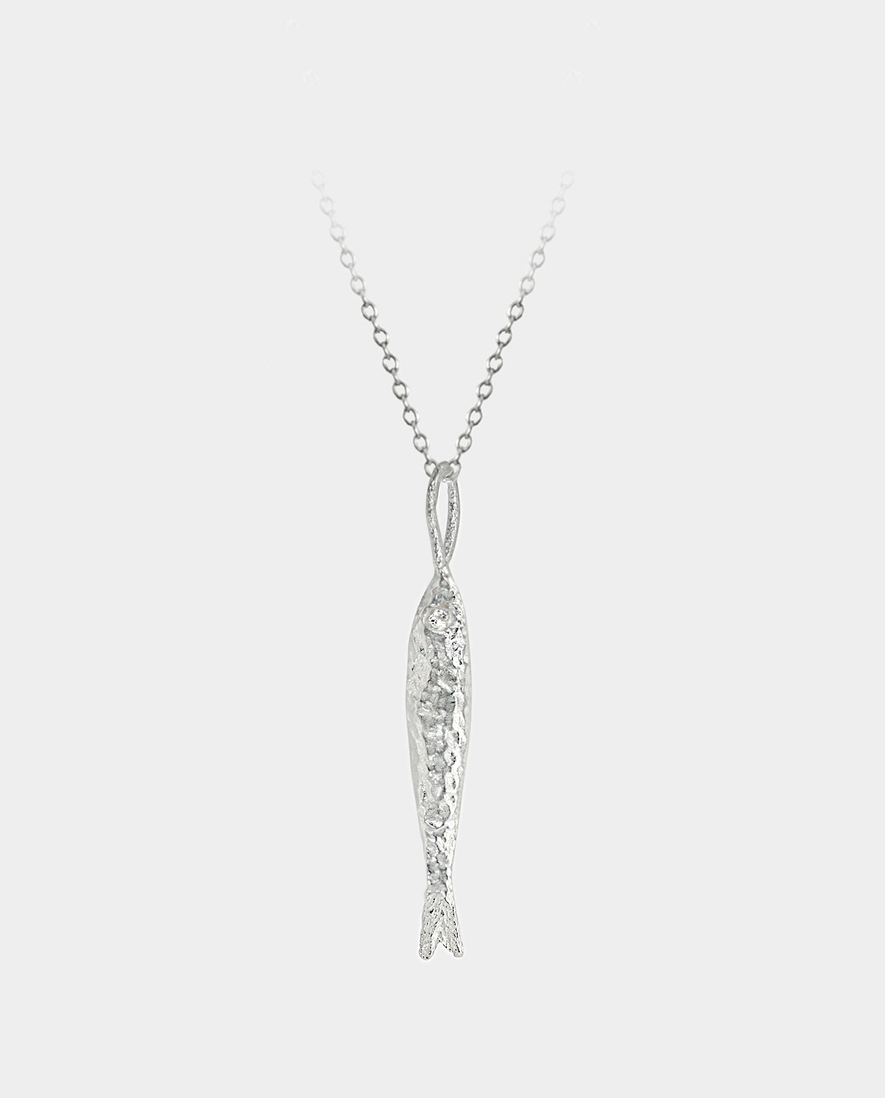 Halskæden bærer en slank sardin som vedhæng. Den er netop ikke glatpoleret, men har karakter i teksturen. Sådan fanger hver uregelmæssighed i sølvet lyset og får fisken til at genskinne i solen, præcis som jeg har oplevet det på Algarvekystens, når de små