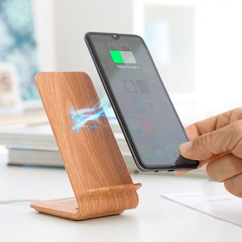 Stander med indbygget trådløs oplader fremstillet af ABS. Standeren er egnet til både iOS og Android og måler 10 x 14.5 x 7 cm.