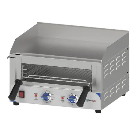– Rustfri stålkonstruktion- Solid stålplade- Tænd/sluk knap- 2 varmeindikatorer- 2.500 W snackplade- Justerbar termostat fra 140°C til 300°C- 1.100 W brødrister- 8 justerbare temperaturniveauer- 2 sikkerhedstermostater- Fedtopsamlingsbakke- Kogeplade: 5