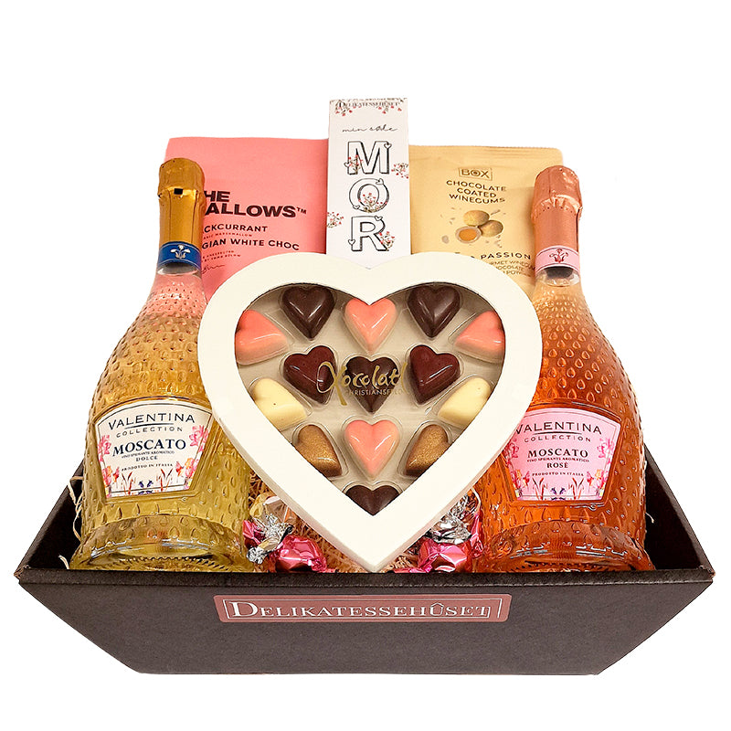 Forkæl din mor med en overdådig gave på Mors dag Send gavekurven direkte hjem til din mor og vedlæg et kort med din personlige hilsen. Gaven indeholder: Mousserende Moscato Mousserende Moscato rosé Hjertegaveæske med 14 fyldte chokoladehjerter fra Xocolat