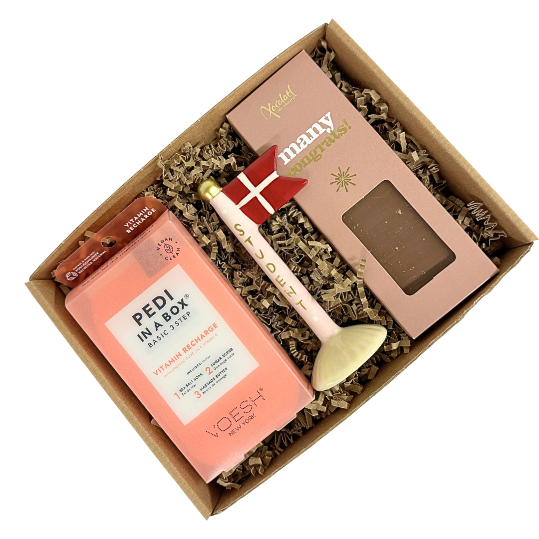 Forkæl studenten med denne fine gave. Efter en hård eksamenstid er chokolade og selvforkælelse lige hvad hun har brug for. Perfekt gave til årets studenter. Gaveløsningen indeholder: Keramik-flag med teksten ‘Student’ fra Speedtsberg Pedi in a box fra Voe