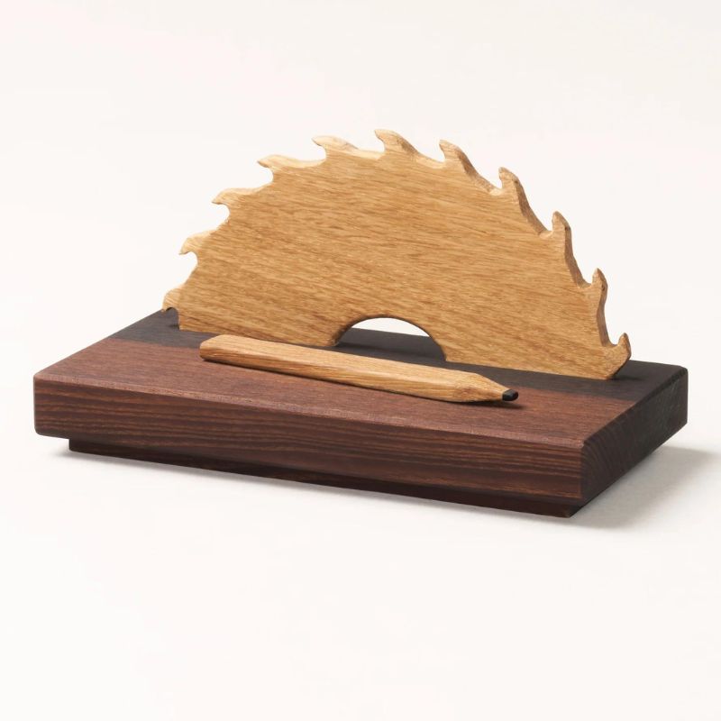 Flot gaveide til den nyuddannede eller erfarne tømrer Træfigur fremstillet af FSC-certificeret egetræ og asketræ i lyse og mørke farver. Figuren forestiller en halv rundsav med takker og en blyant liggende ved siden af. Den måler 18 cm x 9 cm x 9,6 cm. Fi