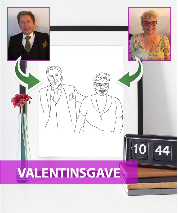 Line art som valentinsgave Bestil en personlig håndtegnet line art tegning som valentinsgave. Det vil være den perfekte til ham eller hende som har alt. 100% unik, personlig & evig – Skræddersyet til dig Levering pr. mail / post – Vælg imellem flere størr