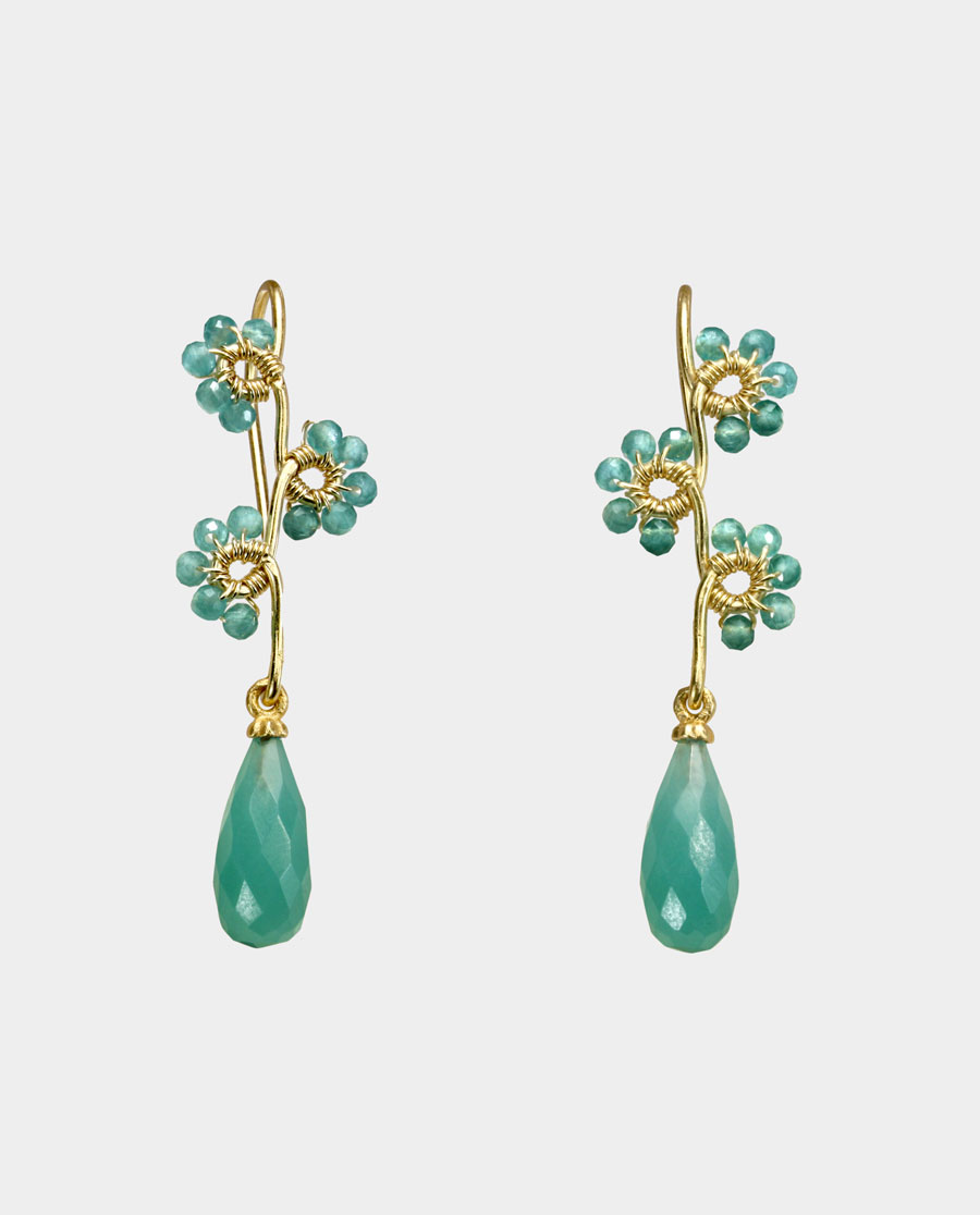 Øreringene er som et fastfrosset øjeblik fra en stille tidlig sommermorgen, hvor naturen stadig ånder. Den fine tråd snor sig som en klatreplante der søger mod lyset og finder fæste i luften.