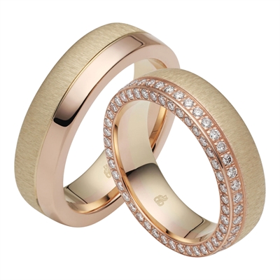 Vielsesringe i 8 kt. Guld og Rosaguld med Brillanter.Vielsesringenes overflade er delvis mat og højglans poleretDameringen er besat med 86 brillanter h/si 086 ct. på forsiden og sidenPrisen er inkl. indvendig diamantgraveringMax. 30 tegn inkl. mellemr
