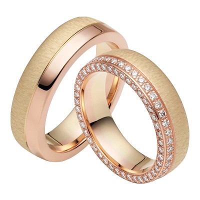 Vielsesringe i Guld og Rosaguld med Brillanter.Vielsesringenes overflade er delvis mat og højglans poleretDameringen er besat med 86 brillanter h/si 086 ct. på forsiden og sidenPrisen er inkl. indvendig diamantgraveringMax. 30 tegn inkl. mellemrumFind