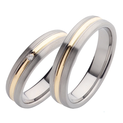 Vielsesringe i Sølv og 8 kt. Guld med Diamant.Vielsesringenes overflade er fin mat og poleret.Dameringen er besat med én brillantsleben diamant w/p1 0,02 ct.Prisen er inkl. indvendig diamantgraveringMax. 30 tegn inkl. mellemrum