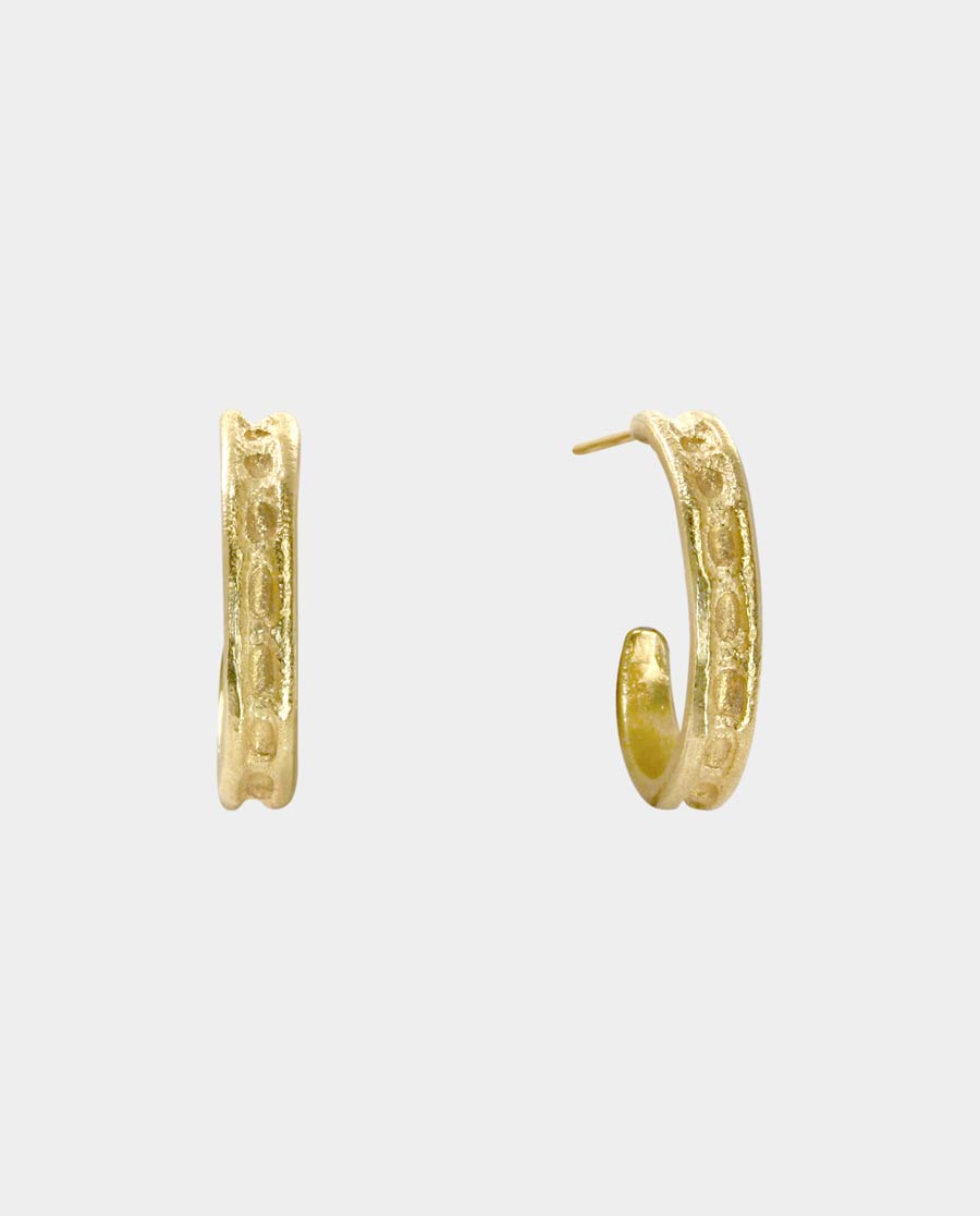 Med deres hule furede tekstur fremstår øreringene som formet af vind og vejr igennem årtusinder. Designet er min hilsen fra guldsmedene i Middelhavnlandenes kystbyer og tid, hvor smykker var mere end pynt de var symboler på status, spiritualitet og en fo